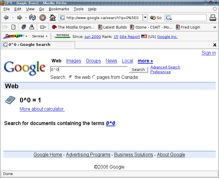 Greatest discovery ever! The news is: 00 = 1. Here's the proof. Just in case I took a screenshot as well. P.S. Apparently the calculator that comes with Windows will give you exactly the same result :)