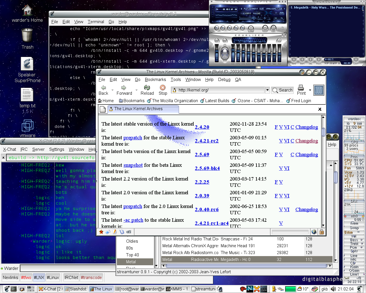Linux What is Linux? Linux is an operating system that was initially created as a hobby by a young student, Linus Torvalds, at the University of Helsinki in Finland. Linus had an interest in Minix, a small UNIX system, and decided to develop a system that exceeded the Minix standards. He began his work in 1991 when he released version 0.02 and worked steadily until 1994 when version 1.0 of the Linux Kernel was released. The current full-featured version is 2.6 (released December 2003) and development continues. And what's the best thing about Linux? IT'S FREE!!! You can download it from the internet or buy a cheap (few bucks) copy or buy a complete boxset with more programs included in it. But first you have to decide on a Linux distribution, i.e. a combination of the Linux kernel (the core of the operating system) and 1000's of applications/games/etc. offered by different companies. For newbies I would recommend distributions such as Mandrake, RedHat or SuSe. You may also want to explore the different Linux Distributions and choose one or you may build your own (not a recommended option for newbies). For more information about Linux visit http://www.linux.org/ Here's a screenshot.Already using Linux? If you already use Linux and have any questions/problems with it or just want to say hello, drop by on irc (see the contact section for details). Also get counted today! And finally if you're not sure how to pronounce Linux click here (Linux people "cat english.au > /dev/dsp", Windows users use Winamp) .